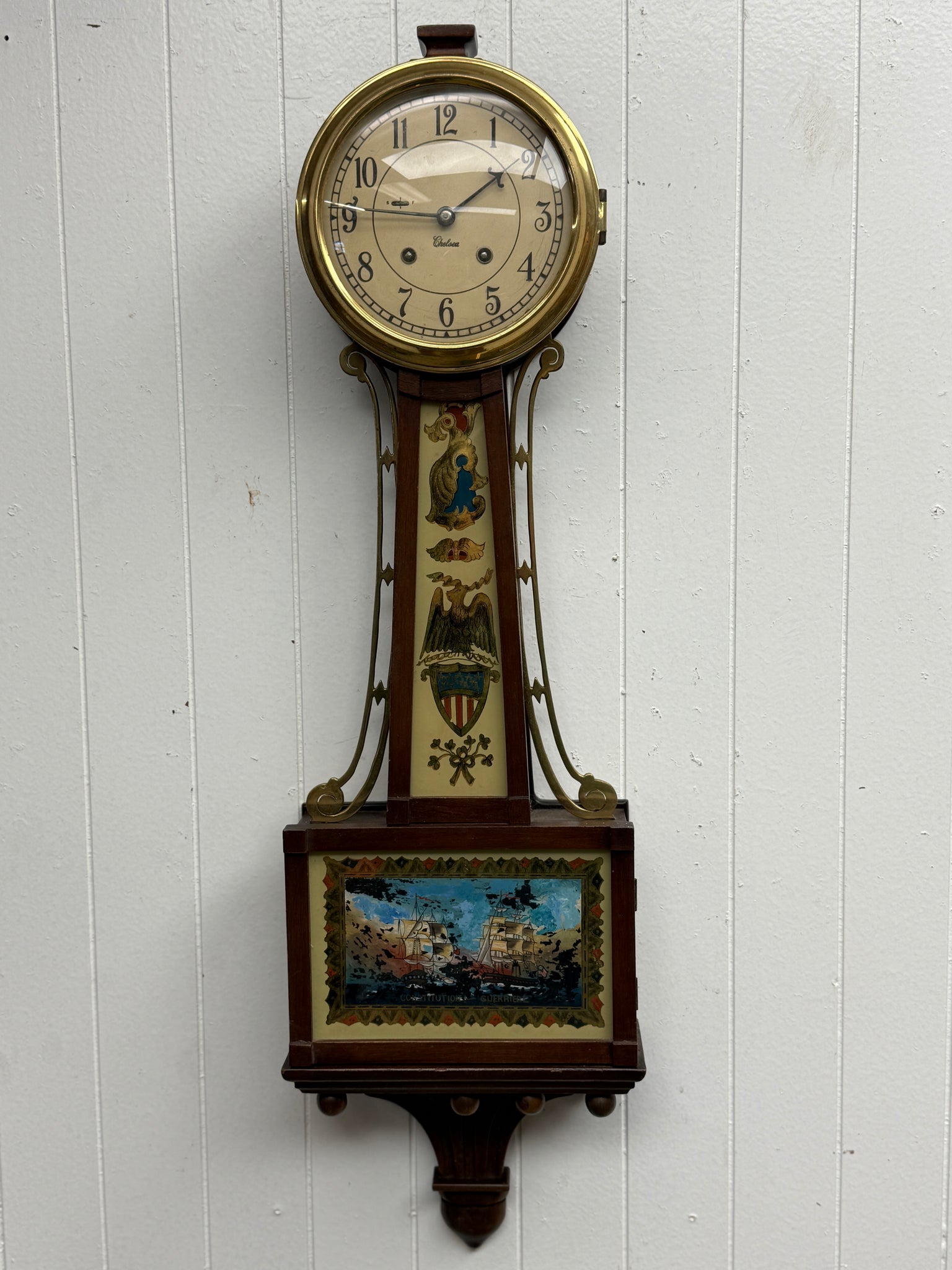 Antique Banjo-Style Chelsea Clock - Constitution - HMS Querriere reverse painting