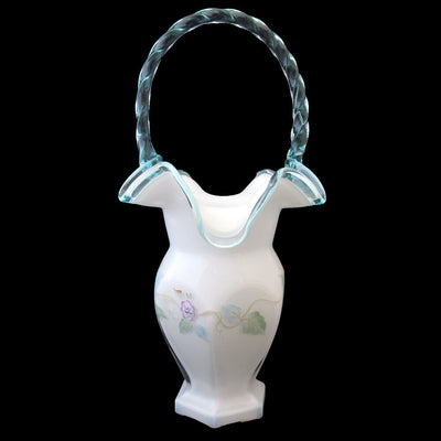 Fenton Milk Glass Handled Basket with hand painted design, clear aqua edge - signed