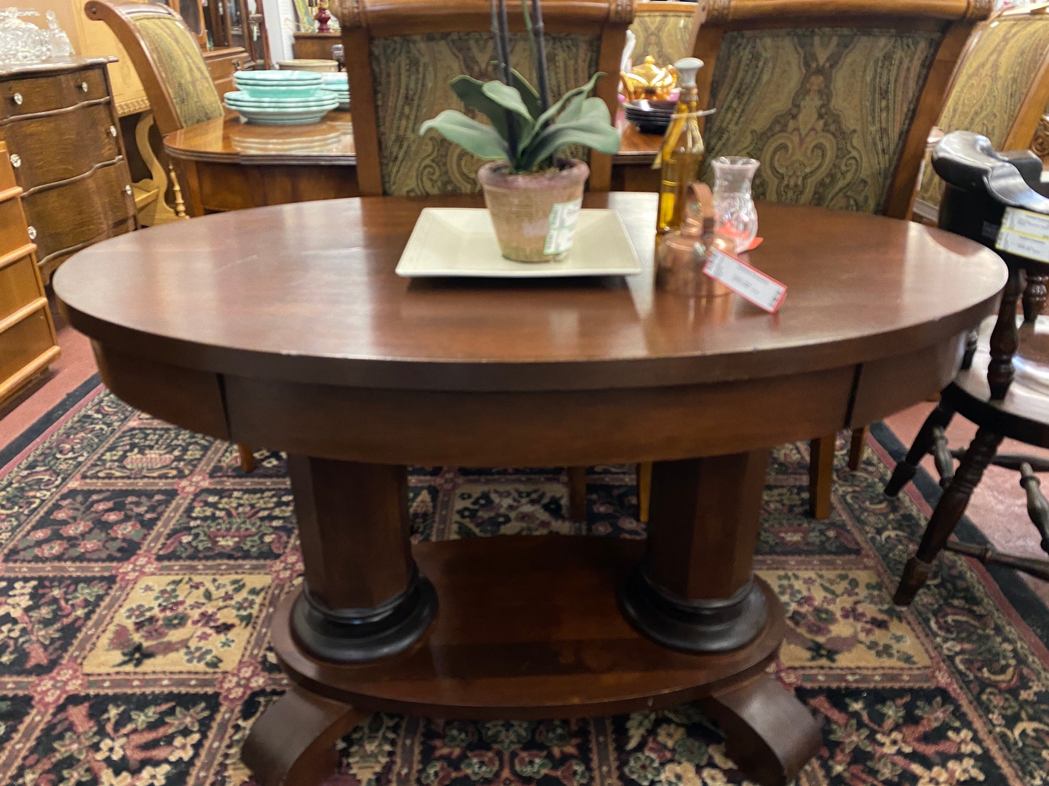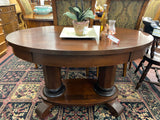 Antique Mahogany Oval Library Table with Drawer, Shelf, & Double Pedestal Base
