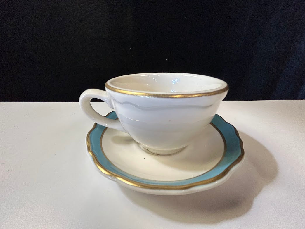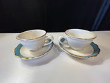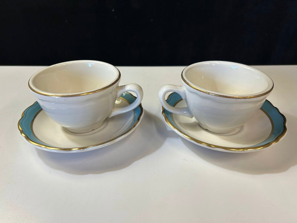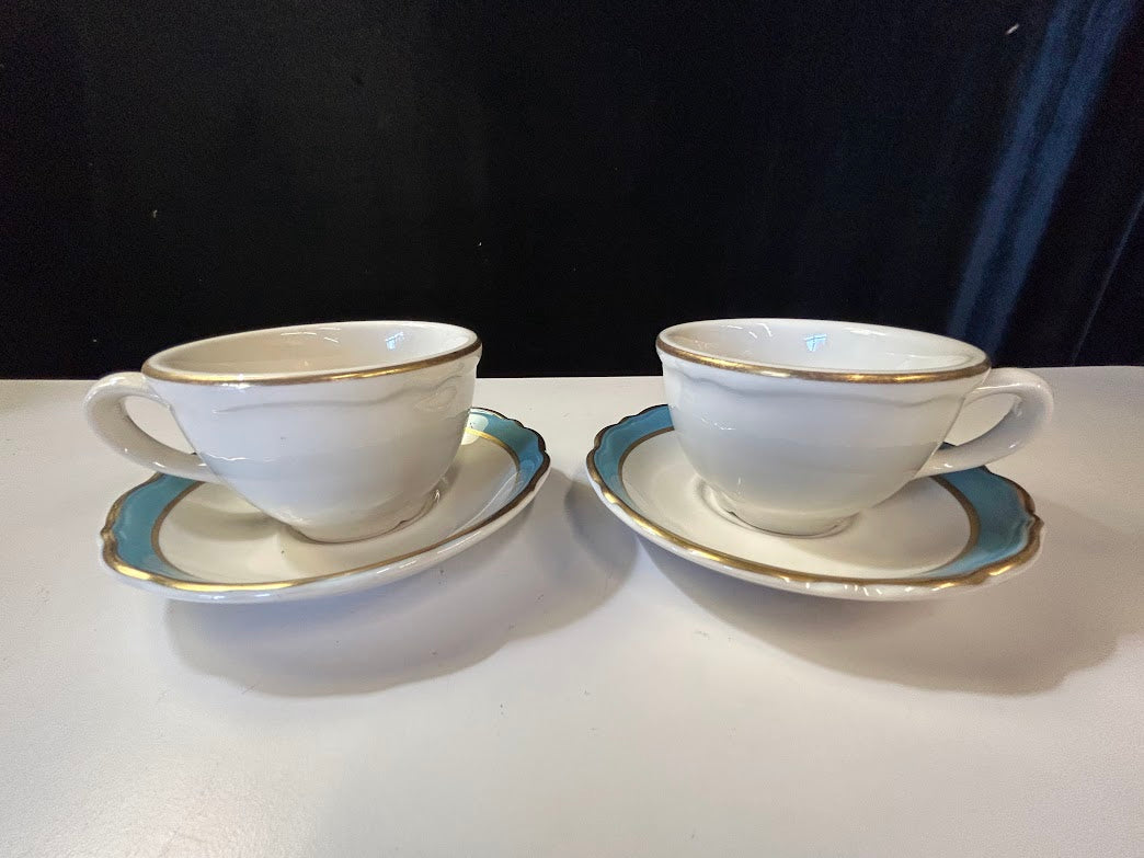 Set of two. Tea cups with saucers. White, Blue, and Gold.